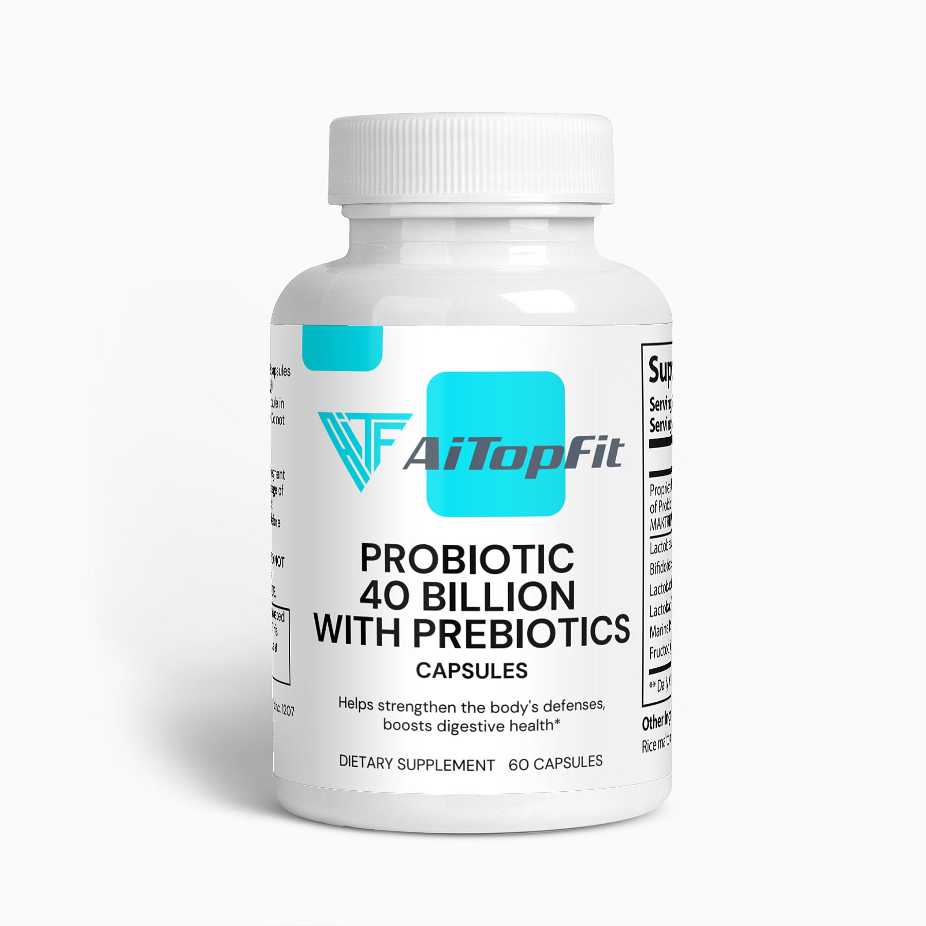 Probiotic 40 Billion with Prebiotics is a blend of four probiotic strains: Lactobacillus Acidophilus, Bifidobacterium Lactis, Lactobacillus Plantarum, and Lactobacillus Paracasei.
